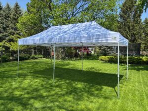 Our heavy-duty 10×10 pop-up tents are a great option when all you need is a bit of sun shade. This affordable option, available for both customer pickup and delivery, features 1.6″ hexagon legs for added strength and stability along with 4 sand bags for weight. Please note that pop-up tents are for customer setup only and are only for fair weather use. Provides 100 sq/ft of coverage. Requires 1-2 people for setup and teardown.