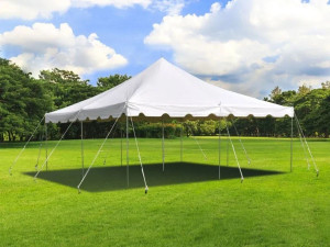 - Comes with a 20’x30′ tent top, 10 2-piece side poles, 2 3-piece center poles, and 14 24″ tent stakes. A tarp and small sledgehammer are required for installation, provide your own or rent them from us.