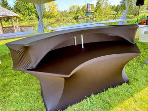 This one-of-a-kind epoxy river bartop, hand-crafted in our own in-house woodshop, is a stunning centerpiece to any event. Constructed from 2 genuine aged bourbon barrels that have been lightly refurbished in-house along with a custom-built solid wood epoxy river style top, this 6-foot showstopper of a bar needs to be a part of your next event.